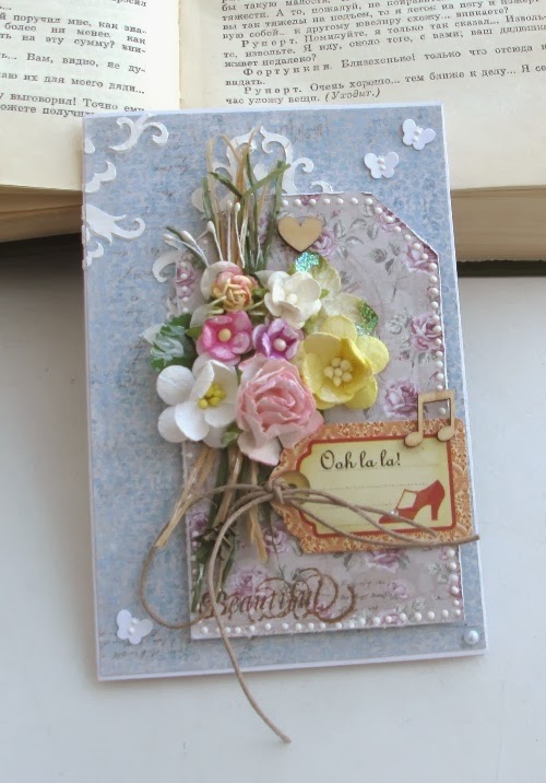 Открытка у меня получилась с использованием 9 цветочков, рафии, тычинок, бумаги любимейшей Maja design, подвески эйфелевой башни, бабочек дырокольных, полужемчужины, стикера G45.
